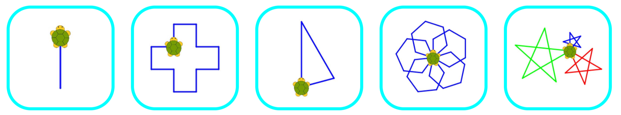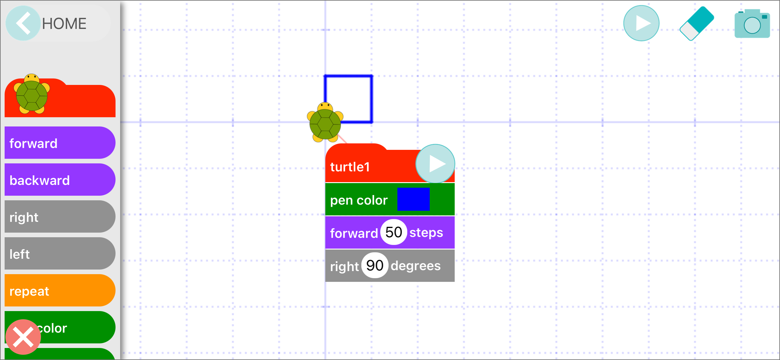 If the turtle moves off the screen, drag the red “turtle1” block to bring it back.